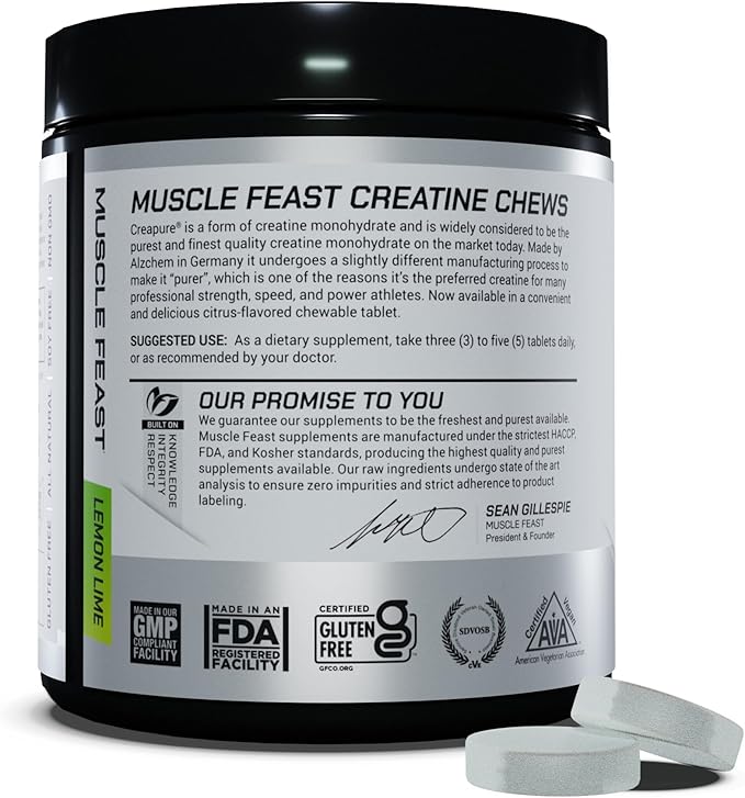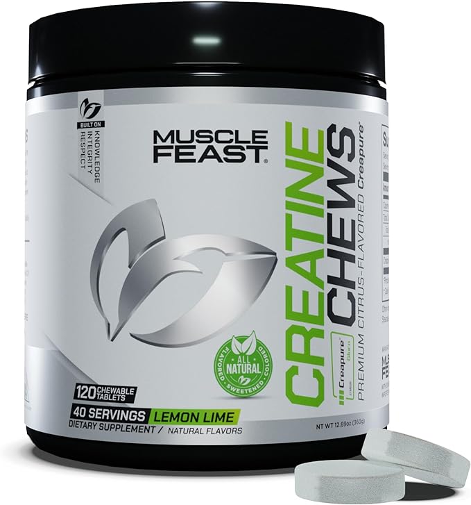 Muscle Feast Vegan Creatine Monohydrate, Gluten-Free Creapure Chews, Lemon Lime, 120 Tabs