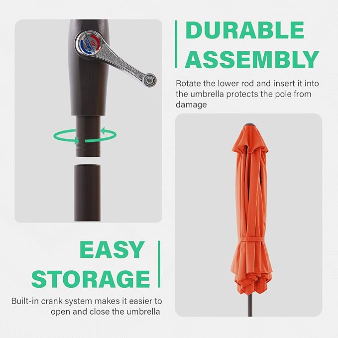 - EASY TO INSTALL&CONTROL: The crank lift mechanism of our patio umbrella makes it easy to open and close the table umbrella in seconds. You can also tilt the umbrella easily by pushing the button to block unwanted sun's rays at any angle