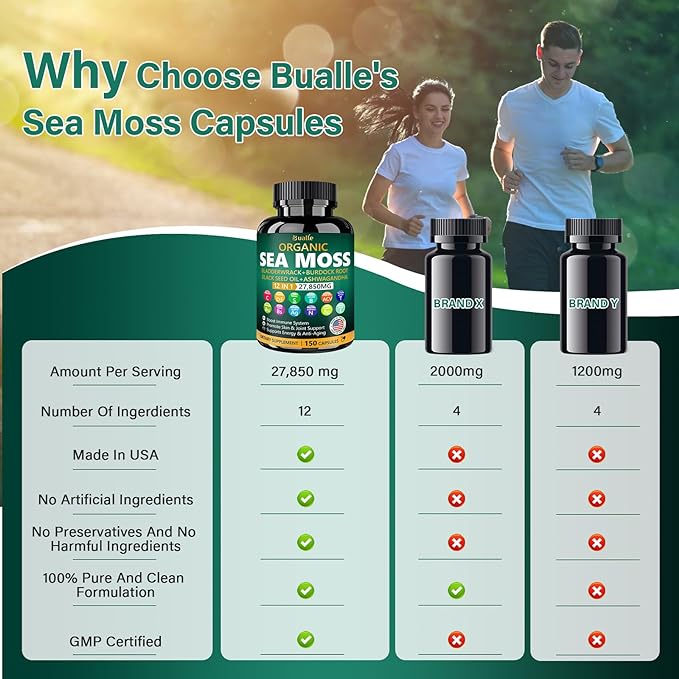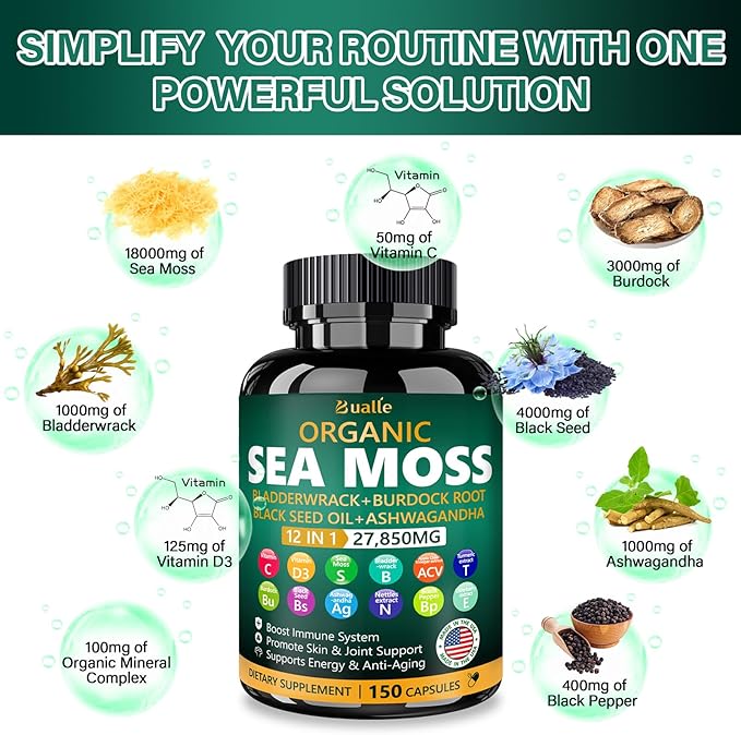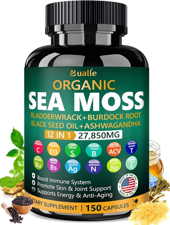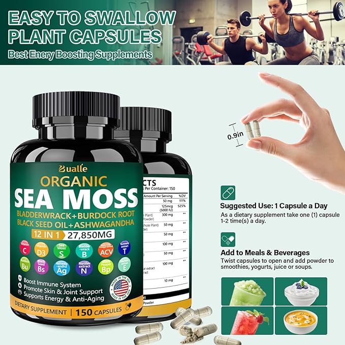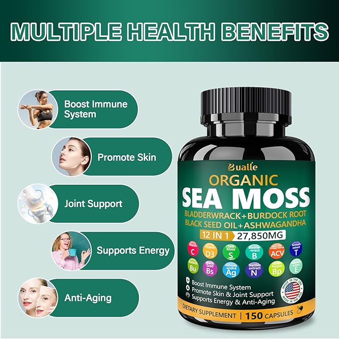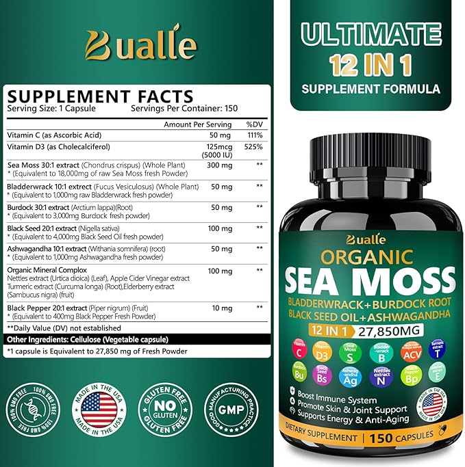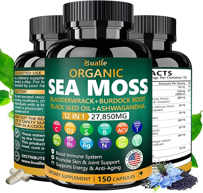 - Organic Sea Moss Capsules:Our Irish sea moss is organic and is a comprehensive combination of Sea Moss Capsules,Black Seed Oil Capsules,Ashwagandha,Bladderwrack and Burdock Root Capsules,enriched with over 12 active ingredients and providing the ultimate in all-round immunity healthy.Bualle sea moss all in one capsules,it boosts the immune system,promotes skin & joint support,and Supports Energy & Anti-Aging.By adding this supplement to your daily life,you will notice significant improvements