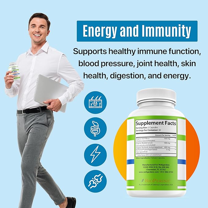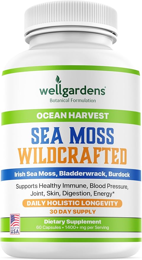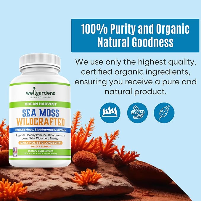 - Nutrient-Rich Superfood Blend: Our Sea Moss Plus capsules are packed with 500mg of organic Irish sea moss, 500mg of organic bladderwrack, and 400mg of organic burdock root, providing a wealth of essential vitamins and minerals, including iodine, zinc, iron, calcium, potassium, and silica.