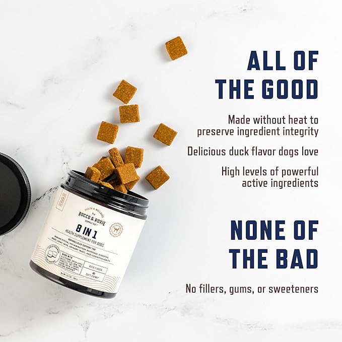 Rocco & Roxie 8 in 1 Dog Vitamins and Supplements, Glucosamine, Green Lipped Mussel Hip and Joint, Probiotics Digestive Health, Immune Skin and Coat, Puppy to Senior Chewable Multivitamin, 90 ct chews