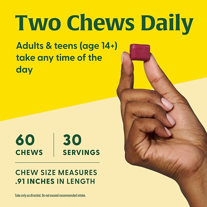 - TASTY STRAWBERRY SOFT CHEWS: Adults take two soft chews daily any time throughout the day; Individually wrapped, so you can conveniently carry your chews on-the-go; 3 g of sugar per 2 chew serving