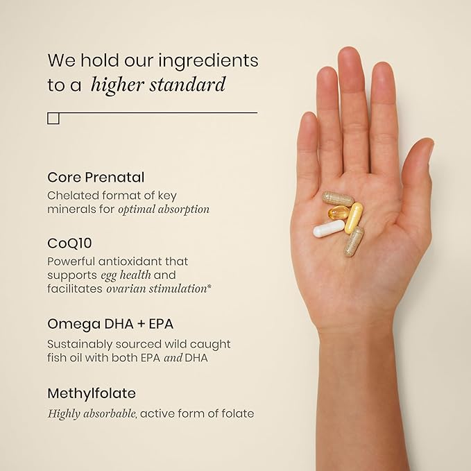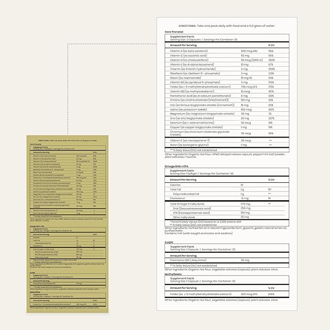 - What's Inside + How to Use - Each daily pill pack includes 2 Core Prenatal vitamins, 1 CoQ10 capsule, 1 Omega DHA + EPA softgel, and 1 Methylfolate capsule. To use, simply take one pack each day with food and a glass of water.