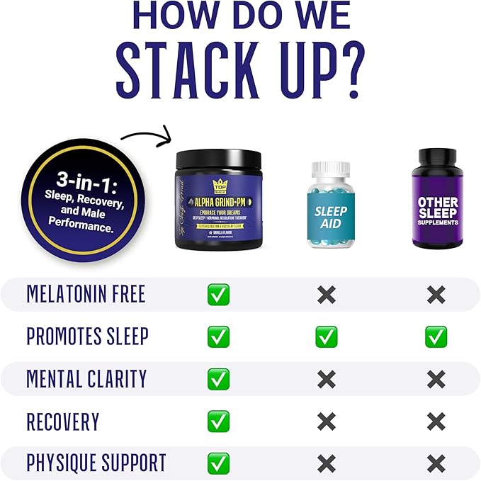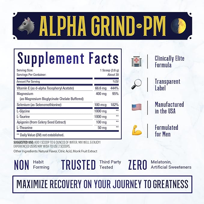 - 💪🏼 RECOVERY - Alpha Grind PM is more than just a sleep supplement; it's a pure powerhouse. With Vitamin E, Magnesium for muscle and nerve function, and Selenium for a healthy immune response, this supplement ensures your body is nourished while you rest.