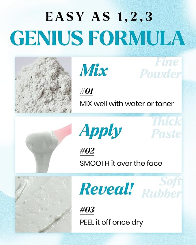 - EASY AS 1,2,3! Mix powder and water 1:1 in a mini bowl (1 spoon covers your face). Spread evenly with the spatula, applying a thicker edge for easy peeling. Leave on for 15–20 mins, peel off, and wipe residue with a cotton pad. Finish with moisturizer. 40 uses per 2.2 lb package!