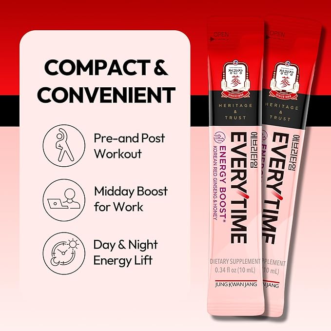 - PORTABLE & GREAT FOR PICK ME UP. Feeling drained? Get the boost without the crash with Everytime! Each compact red ginseng liquid stick fits effortlessly into your routine—whether you're at work, hitting the gym, or traveling. Each 0.34 fl oz (10ml) stick delivers a convenient 1-tablespoon serving—just one a day for an easy boost, where great taste meets function!