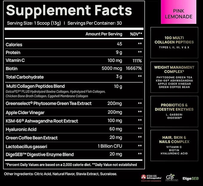 - Special Ingredients : GelcoPEP PLUSยฎ Collagen Peptides, KSM-66ยฎ Ashwagandha, GreenSelectยฎ Phytosome Green Tea Extract, DigeSEBยฎ Digestive Enzyme Blend GelcoPEP PLUSยฎ Collagen Peptides, KSM-66ยฎ Ashwagandha, GreenSelectยฎ Phytosome Green Tea Extract, DigeSEBยฎ Digestive Enzyme Blend