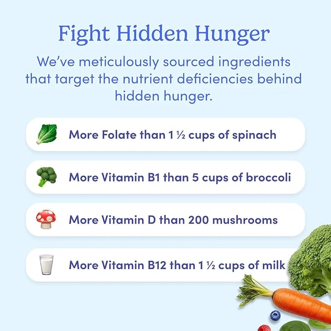 - Designed to Support Healthy Growth & Development: Made with real ingredients, such as kale, beets, carrots and strawberries, our vitamin gummies help aid everything from brain and immune function to hidden hunger and emotional development; each serving has more folate than 1 ½ cups of spinach, more vitamin B1 than 5 cups of broccoli, and more Vitamin D than 200 mushrooms