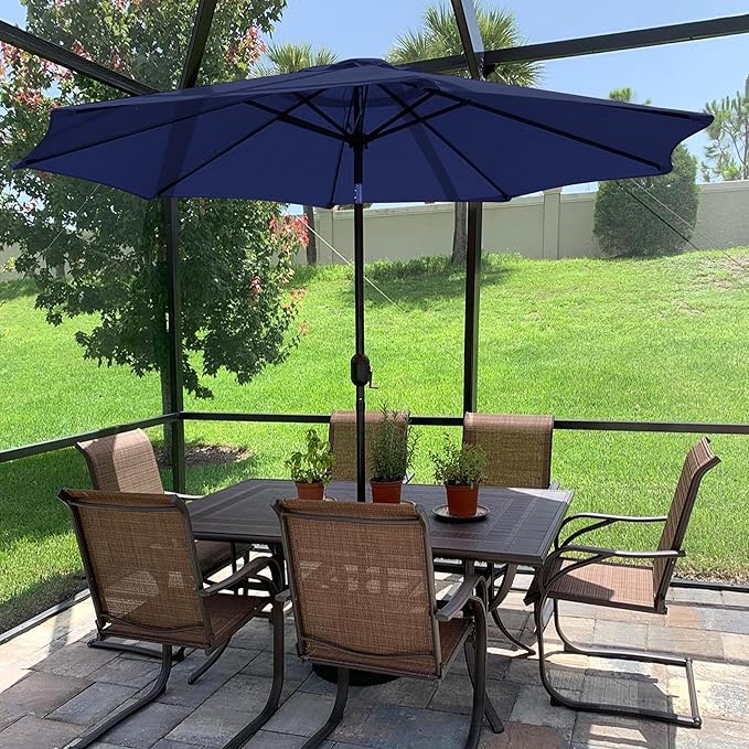 - Effortless crank lift: The crank market umbrella helps you simply and quickly unfurl the 9ft umbrella to offer shade over a patio furniture set of a 42" to 54" table and 4 to 6 chairs or 2 pool loungers.