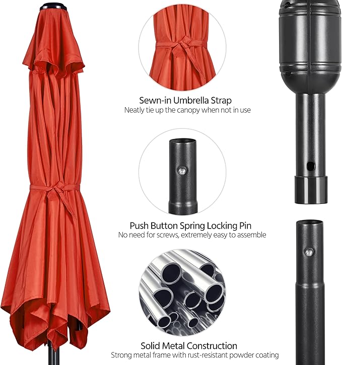 - Sewn-in umbrella strap: A sewn-in umbrella strap helps furl and tie easily the canopy fabric when not in use.