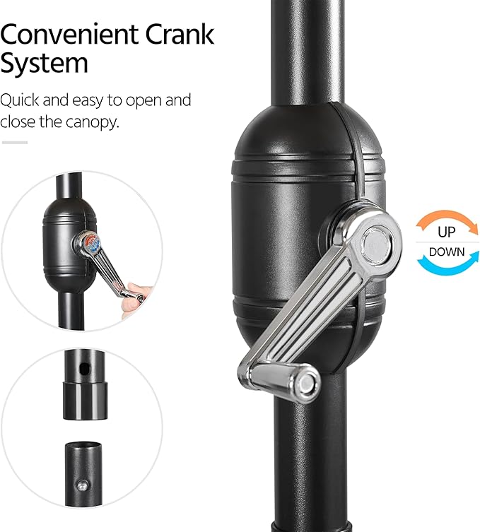 - Convenient crank lift: The crank market umbrella helps you simply and quickly unfurl the umbrella to offer shade over a 36” or smaller patio table with 2 to 4 chairs.