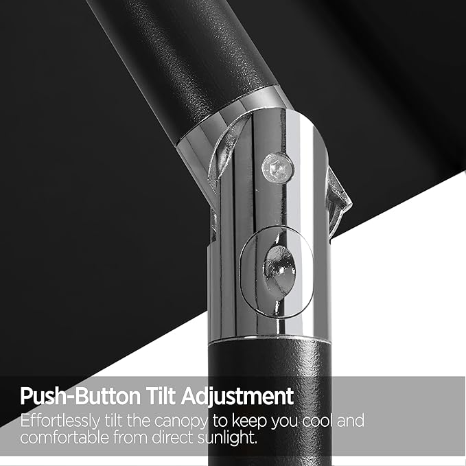- Push-button tilt adjustment: The canopy of the garden umbrella can be manually tilted with a push at the button to move with the sun throughout the day and create a more flexible and consistent shade.
