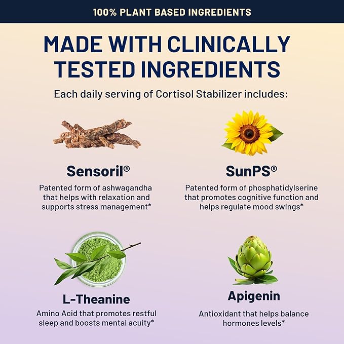Cortisol Manager and Stabilizer Supplement | Supports Deep Sleep & Relaxation | Cortisol Supplement with Ashwagandha, L-Theanine, Rhodiola Rosea Extract & Apigenin | 30 Vegan Capsules