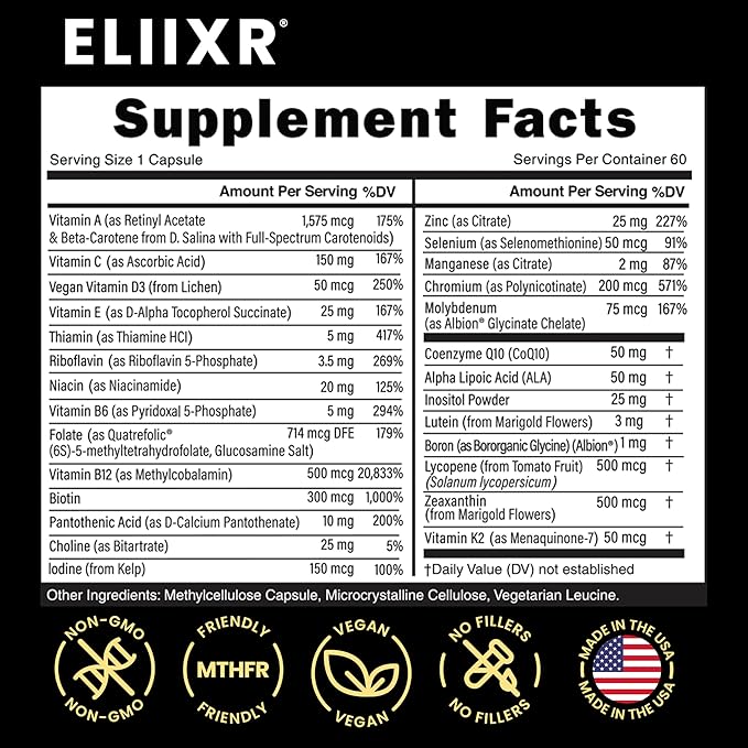 - Convenient daily dose: Each easy-to-swallow vegetable capsule delivers 27 natural vitamins and micronutrients, including zinc, selenium, choline, and potent antioxidants like CoQ10, alpha-lipoic acid, and lutein. These supplements provide essential nutrients in a single daily serving.