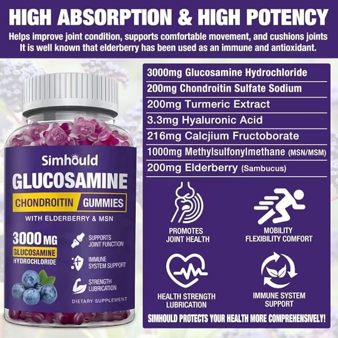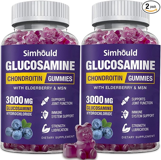 - [ Why Choose Simhould ]: Each Simhould glucosamine chondroitin gummy contains 3000mg glucosamine hydrochloride, 200mg chondroitin sulfate sodium, 200mg turmeric extract, 3.3mg hyaluronic acid, 216mg calcium fructoborate, 1000mg MSM, 200mg elderberry extract are an easy to take gummy suitable for women, men, adults, and children. Simhould Supplements gummies are gluten-free, gelatine-free. And it's pectin-based. You can incorporate them into your daily life.