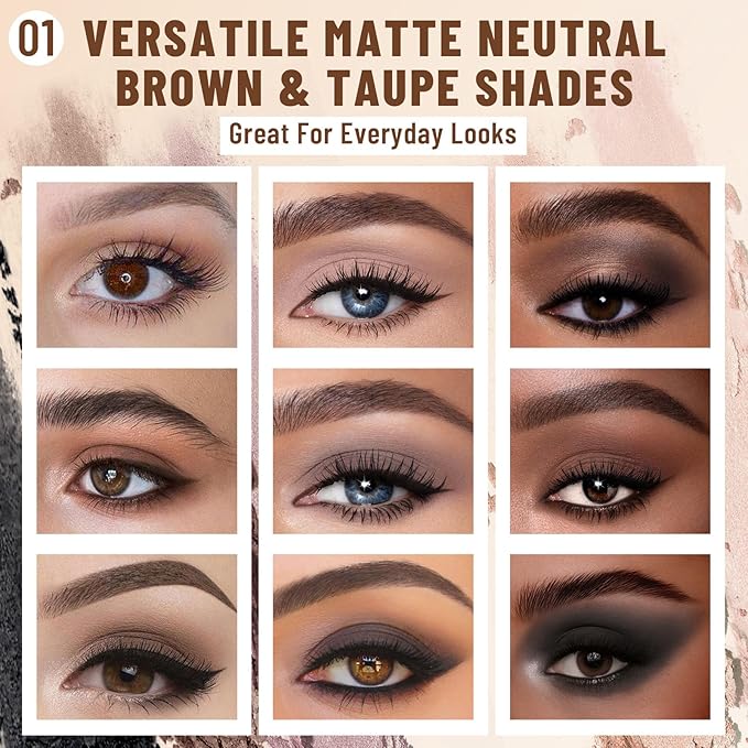- 【Create Looks for All Occasions】This nude eye shadow palette allows you to effortlessly create a variety of eye-catching looks for any occasion. Whether you prefer a subtle, everyday elegance or a bold, smokey eye, it has you covered. The matte & shimmer finish of the shades adds depth and dimension to your eyes, enhancing their natural beauty.