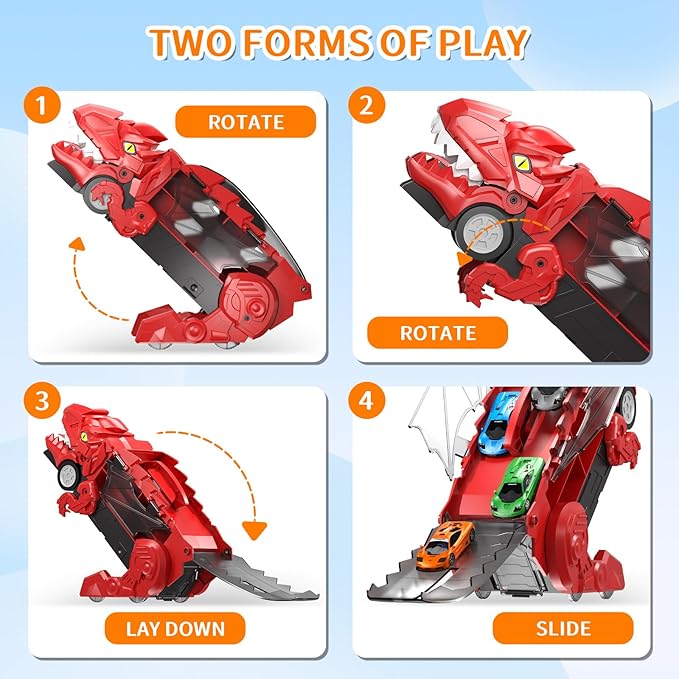- 【Race, Store, or Transform!】 - Dual Race Track Mode – Flip the dinosaur’s back into parallel tracks for exciting car races. - 16-Car Storage – Holds mini cars inside for easy cleanup. - Standing Dino Mode – Adjust the legs to turn the truck into a ferocious standing T-Rex!