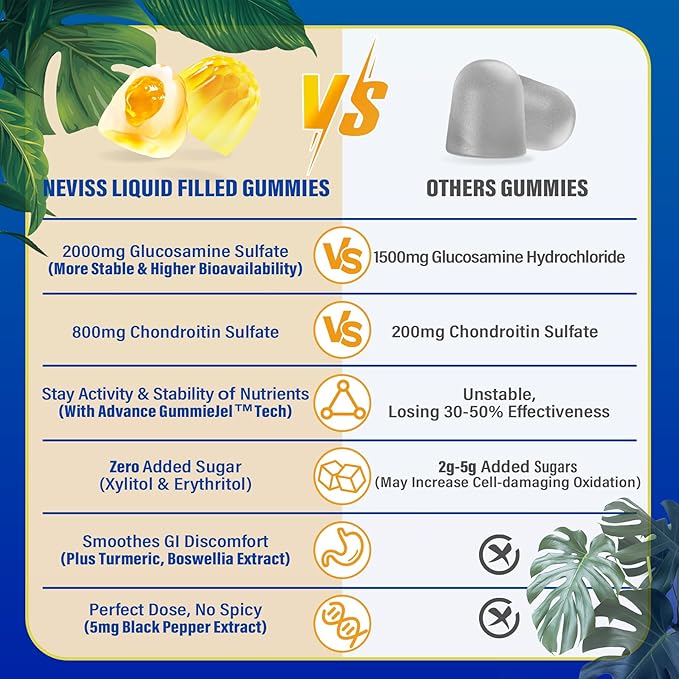 - 【THE FIRST GLUCOSAMINE LIQUID-FILLED GUMMIES】Our glucosamine liquid-filled gummies are adopted with advanced GummieJel gummy-filled Technology that locks active ingredients in the center, to ensure stability, absorption, and bioavailability.