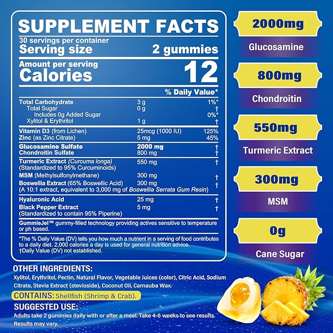 - 【DELICIOUS GLUCOSAMINE GUMMIES】Our pectin-based chewy gummies embrace a liquid-filled center that bursts with a delightful pineapple flavor, suitable for men and women.