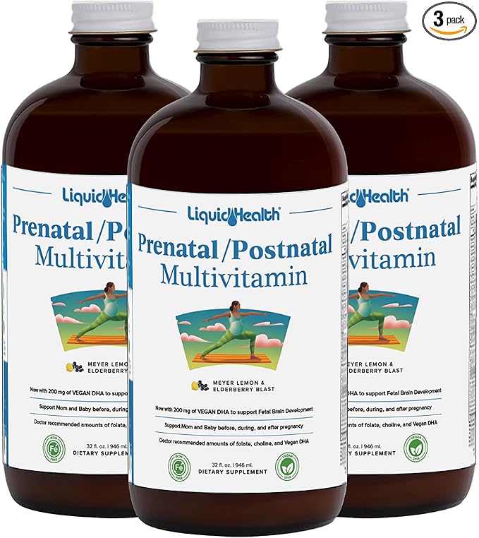 LIQUIDHEALTH Prenatal/Postnatal Multiple Liquid Women's Multivitamin with Real Folate - Pre & Postnatal Vitamins for Before, During, After Pregnancy - Vegan, Sugar-Free, Non GMO, Great Taste (3 Pack)