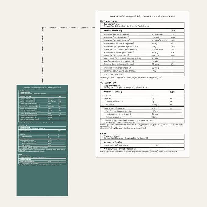 - What's Inside - Our Men's Multi Support packs include two Mens Multivitamins, one Omega DHA + EPA softgel, and one CoQ10 capsule. Each pill pack represents a full day's worth of men's vitamins, and should be taken with food and water.