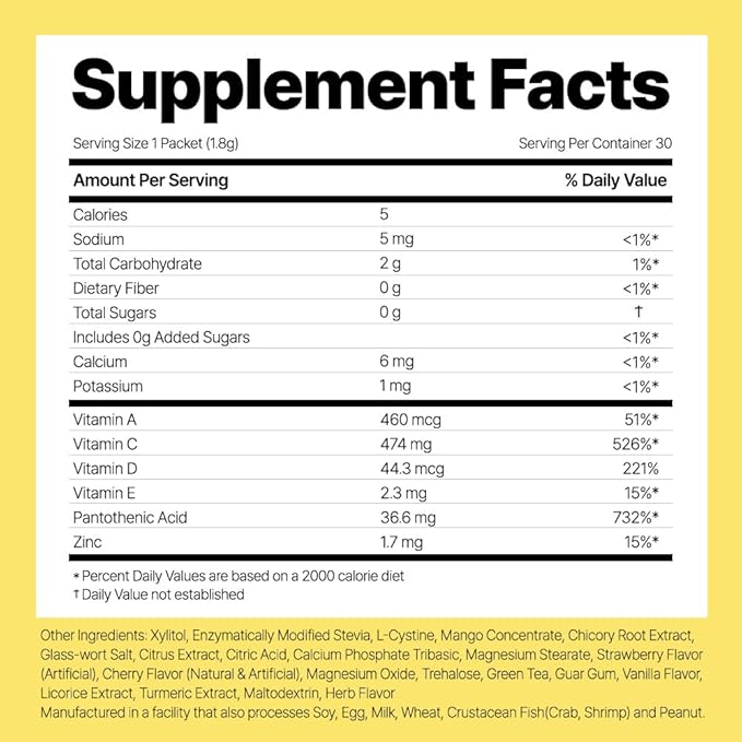 - BRIGHTENING FORMULA - Vitamin Complex with Vitamin C, A, D, E, Citrus extract, and L-cysteine for intense antioxidant protection and a clearer, brighter complexion. It also contains pantothenic acid and zinc, which are known to help improve the appearance of breakouts and blemishes.