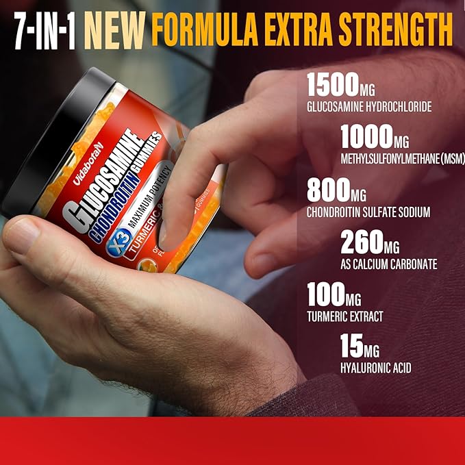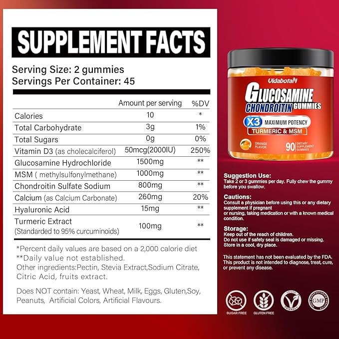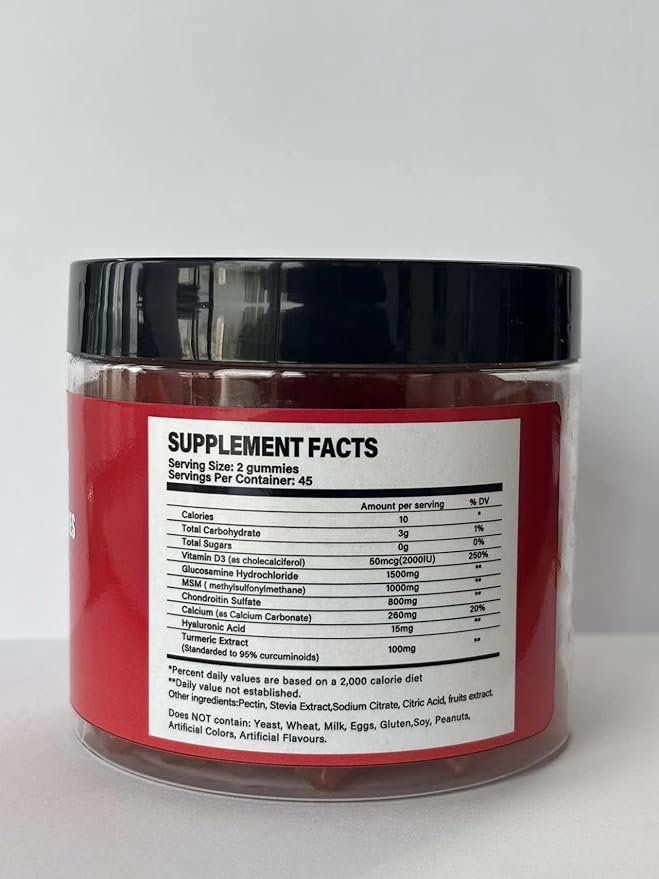 - [ Best Formula]- Each serving of our gummies contains a high potency of 1500mg Glucosamine, 1000mg MSM, 800mg Chondroitin, Turmeric, Calcium, Hyaluronic Acid, and Vitamin D3. This formula is scientifically backed and recognized as the best.