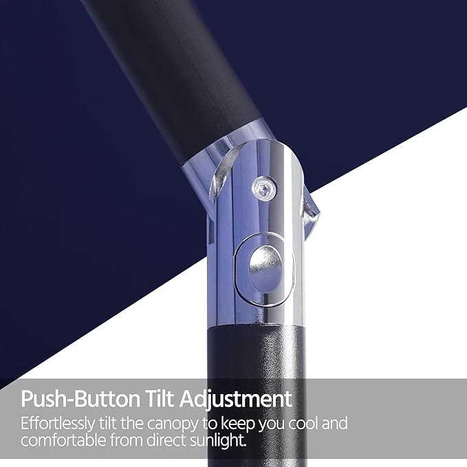 - Push button tilt adjustment: The umbrella canopy can be easily tilted in 2 directions with a push at the button to create a more flexible and versatile shade coverage in the patio, deck, garden or café, restaurant.