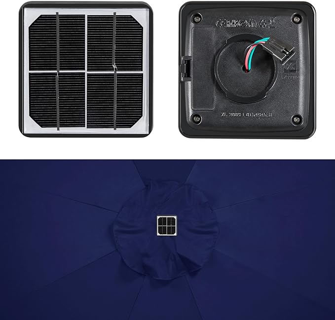 - 32 solar-powered led lights: Each rib of this patio umbrella is kitted out with 4 solar-powered LED lights. Powered by the top solar panel and a solar AA rechargeable battery, these lights have a run time of 8 hours after a full charge. A handy switch on the pole controls the lights.