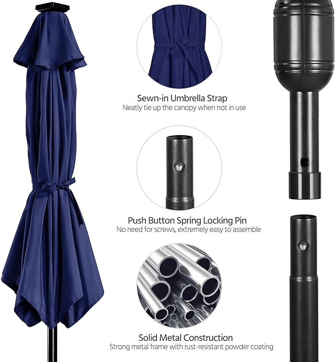 - Durable materials & Strong construction: The 9ft canopy of this LED umbrella is made of durable water-resistant 180g polyester, and is supported by 8 quality metal ribs. It’s mounted on an anti-rust powder-coated metal pole with a 1.5” diameter.