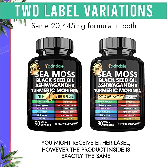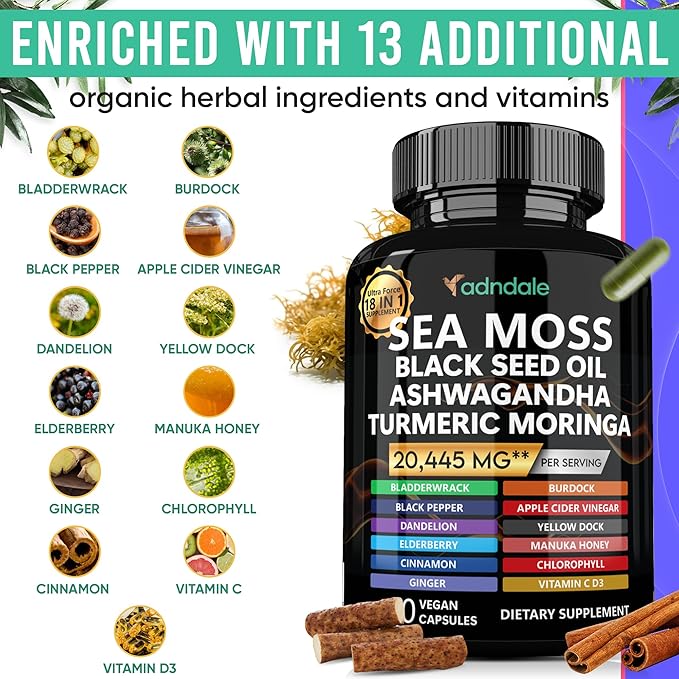 - COMPREHENSIVE ULTRA FORCE 18-IN-1 SEA MOSS FUSION: Adndale proudly presents a groundbreaking supplement fusion led by Sea Moss, featuring a total of 18 potent ingredients in one powerful blend, providing energy, joint and cognitive function support. This comprehensive formula includes Sea Moss, Black Seed Oil, Ashwagandha, Ginger, Turmeric, Moringa, Bladderwrack, Burdock, Vitamin C, Vitamin D3, Black Pepper, Apple Cider Vinegar, Dandelion, Yellow Dock, Elderberry, Manuka Honey, Chlorophyll, and Cinnamon.