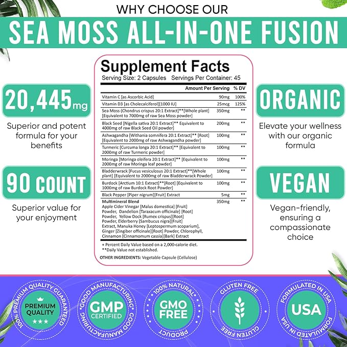 - DESIGNED FOR UNIVERSAL WELLNESS: Tailored for both women and men, our 18-in-1 Sea Moss Fusion offers a holistic solution for well-being. With diverse ingredients such as Bladderwrack, Manuka Honey, and Chlorophyll, this blend caters to various health needs, making it suitable for a broad audience. These seamoss black seed oil ashwagandha burdock root turmeric moringa capsules provide a great alternative to sea moss gummies, black seed oil gummies, turmeric gummies and ashwagandha gummies for women and men.