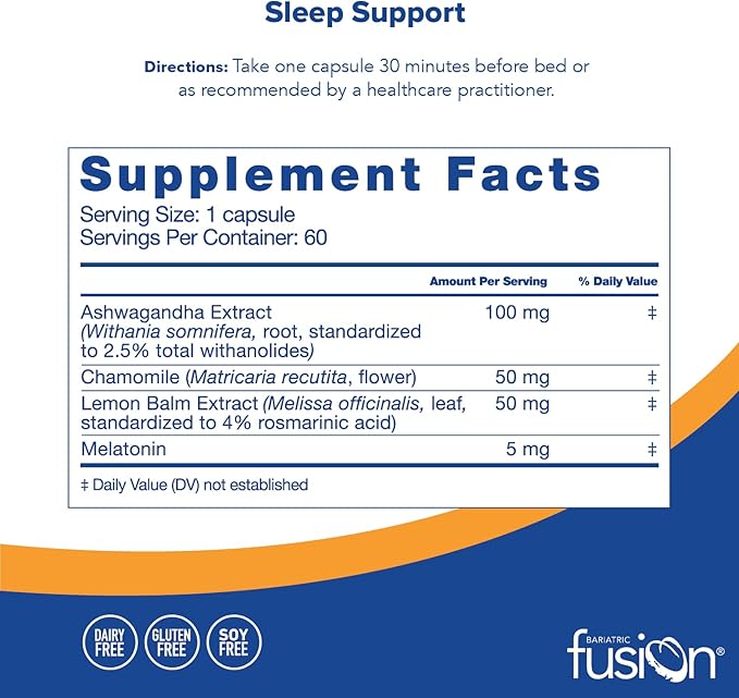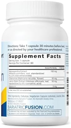 - Bariatric Formulation: Bariatric Fusion Sleep Support* features 50mg melatonin, 50mg chamomile, 100mg ashwagandha, and lemon balm extract. The addition of melatonin complements this sleep blend well.