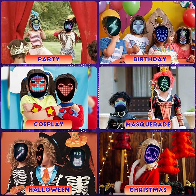 - [Fun and Inspiration Technology Mask]: The bright and vibrant colors, along with the excellent graphics and animations, ensure that you'll grab everyone's attention. Our Led Mask combines novelty and fun with a sense of technology, to make you stnad out at all the party!