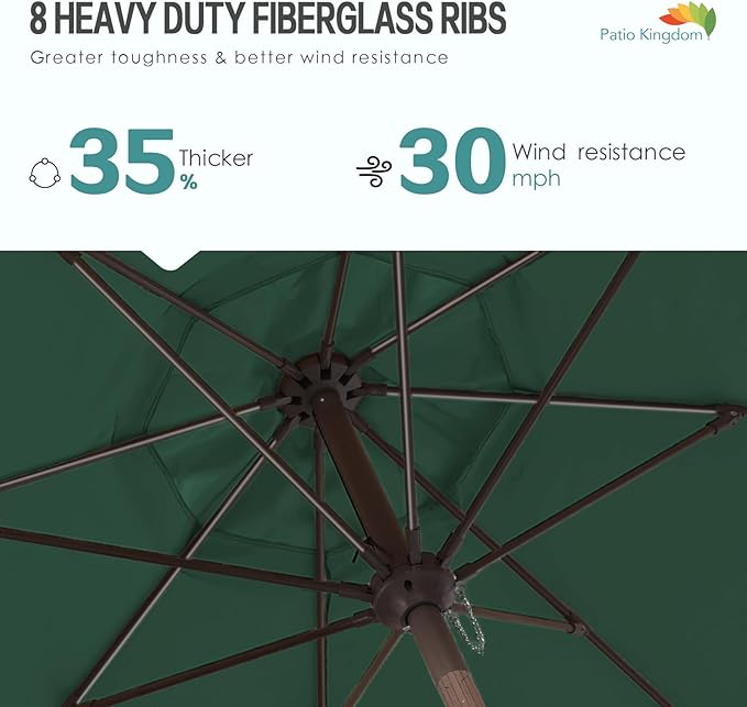 - STURDY FIBERGLASS RIBS: Patio kingdom has designed reinforced fiberglass ribs, that won't rust, lighter than steel for easy and compact storage, makes operation easier. Powder coated iron pole and 8 sturdy fiberglass ribs provides stronger support and are built for stability