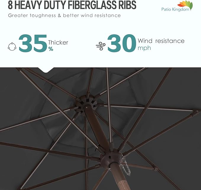- STURDY FIBERGLASS RIBS: Patio kingdom has designed reinforced fiberglass ribs, that won't rust, lighter than steel for easy and compact storage, makes operation easier. Powder coated iron pole and 8 sturdy fiberglass ribs provides stronger support and are built for stability