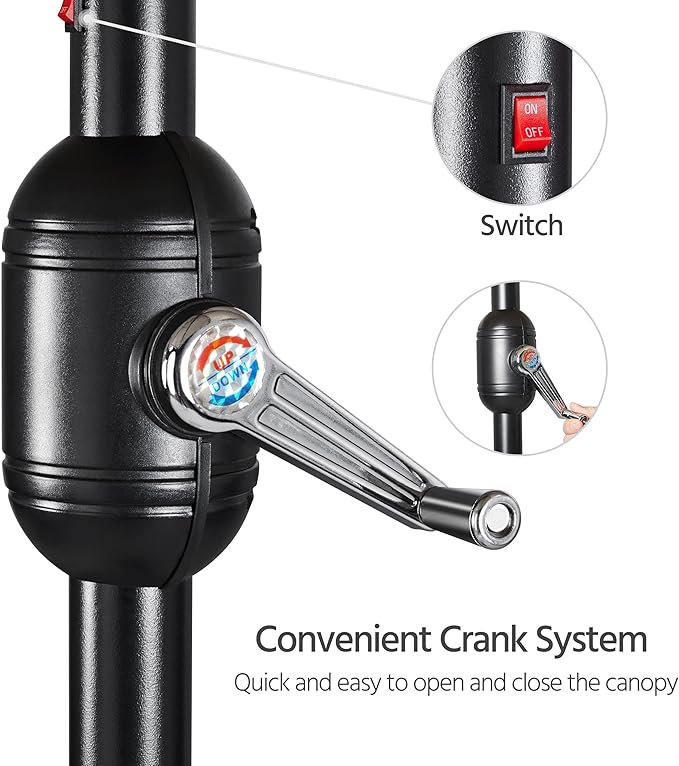 - 32 solar-powered led lights: Each rib of this patio umbrella is kitted out with 4 solar-powered LED lights. Powered by the top solar panel and a solar AA rechargeable battery, these lights have a run time of 8 hours after a full charge. A handy switch on the pole controls the lights.