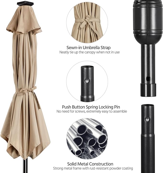 Yaheetech 10FT Solar Powered Patio Umbrella - UV Protection Market Table Umbrella w/ 32 LED Lights & Push Button Tilt & Crank Lift System for Garden/Lawn/Deck/Backyard/Pool,Tan