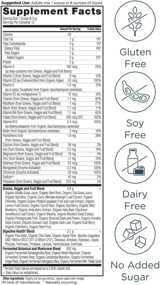 - SUPERFOOD FORMULATION: Supports healthy digestive function, detoxification, healthy energy, reduces occasional gas & bloating, and helps maintain healthy gut microflora. This mixable powder formula is the first ever certified organic greens + certified organic vitamins and minerals in one. It rolls two supplements (a multi and a greens product) into one so you can get the essential vitamins and minerals your body craves, and digest, detox and energize in one simple scoop.