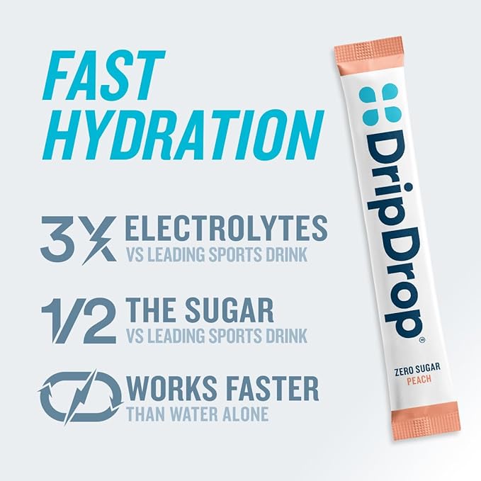 DripDrop Hydration - Zero Sugar Peach - Electrolyte Drink Mix Single Serve Hydration Powder Packets | Non-GMO, Gluten Free, Vegan | 32 Sticks