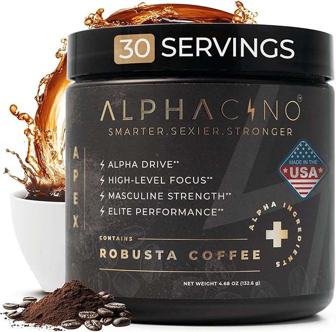 Alphacino Apex - Instant Coffee Powder for the Robust Vigorous Men - Muscle Growth, Sharp Focus, Enhanced Stamina - Ashwagandha KSM-66, Lion’s Mane Mushroom, Black Maca Extract, S7-30SV (4.68 oz)