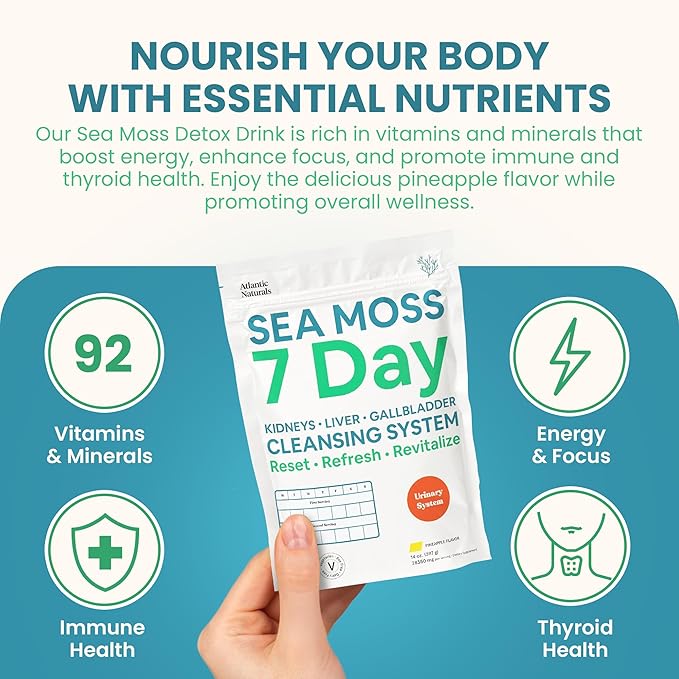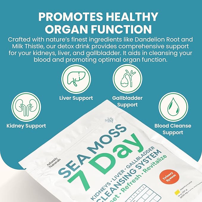 Atlantic Naturals Sea Moss 7 Day Detox Liver, Gallbladder & Kidney Cleanse - Support with Dandelion Root, Milk Thistle, Burdock Root, Red Clover, Chanca Piedra - Pineapple Flavor Drink Mix (14 oz)