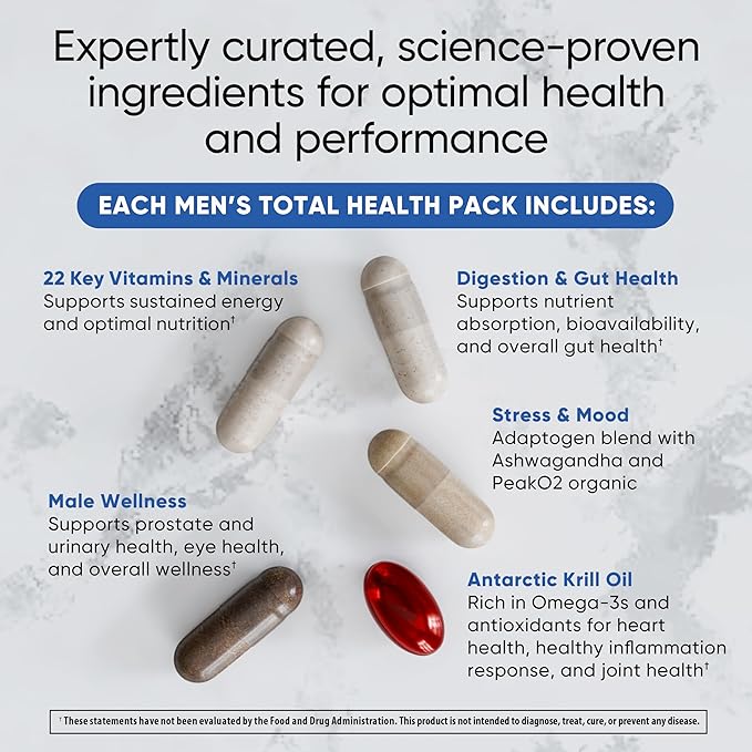 Men's Total Health Pack Daily Multivitamin Supplement, Energy, Stress Support, Krill Oil, 22 Key Vitamins & Minerals, VIT D, C, B12, E, A, B6, K, Biotin, Zinc, Astaxanthin (30 Pack)