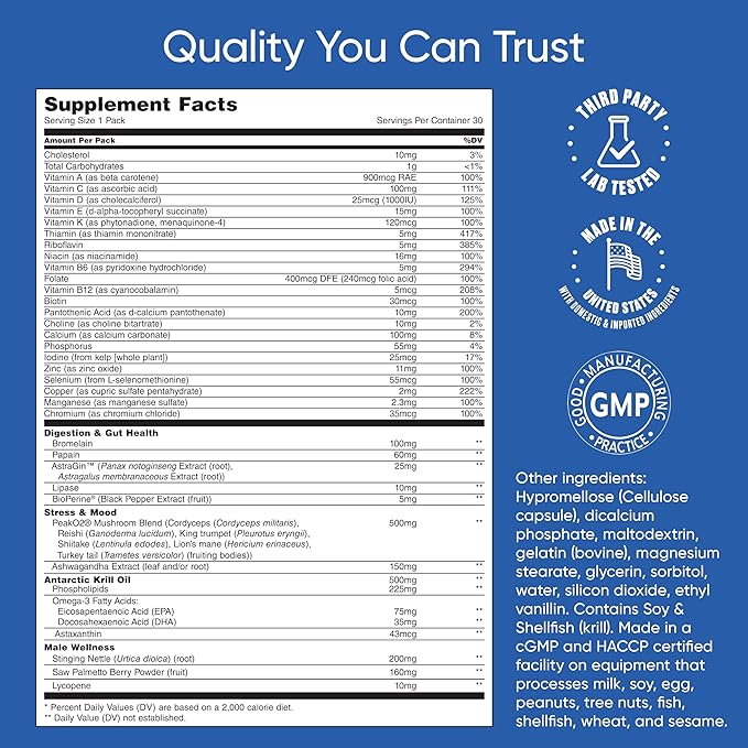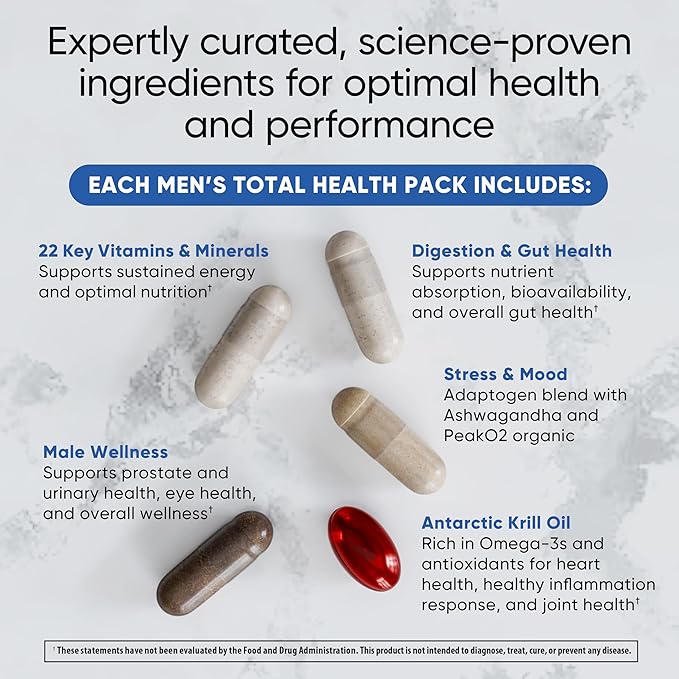 Men's Total Health Pack Daily Multivitamin Supplement, Energy, Stress Support, Krill Oil, 22 Key Vitamins & Minerals, VIT D, C, B12, E, A, B6, K, Biotin, Zinc, Astaxanthin (30 Pack)