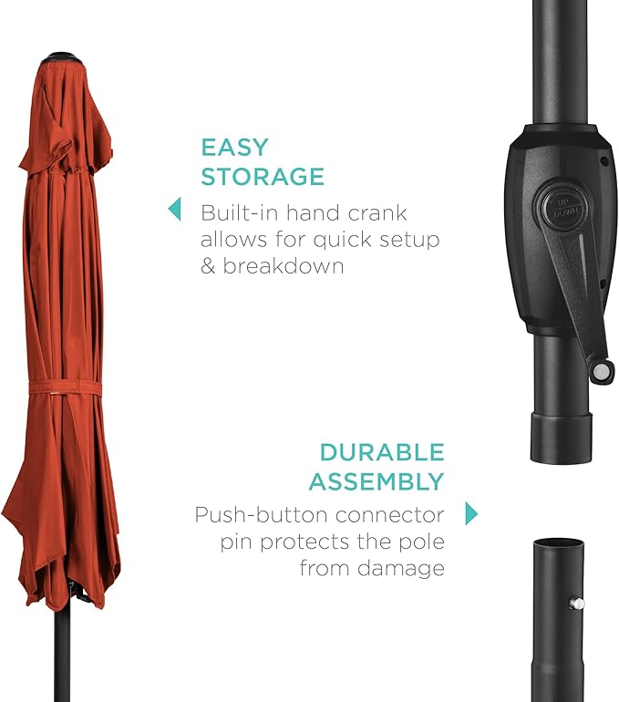 - USER-FRIENDLY MECHANISMS: Features a hand-operated crank to open and close the umbrella with ease, while a push-button tilt system adds extra security against the sun