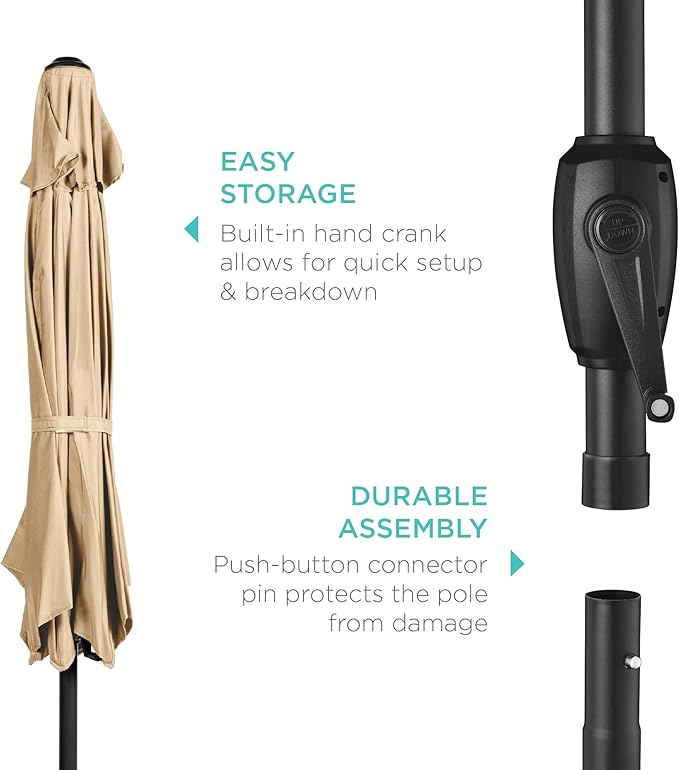 - USER-FRIENDLY MECHANISMS: Features a hand-operated crank to open and close the umbrella with ease, while a push-button tilt system adds extra security against the sun