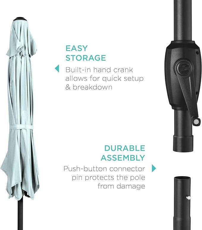 - USER-FRIENDLY MECHANISMS: Features a hand-operated crank to open and close the umbrella with ease, while a push-button tilt system adds extra security against the sun