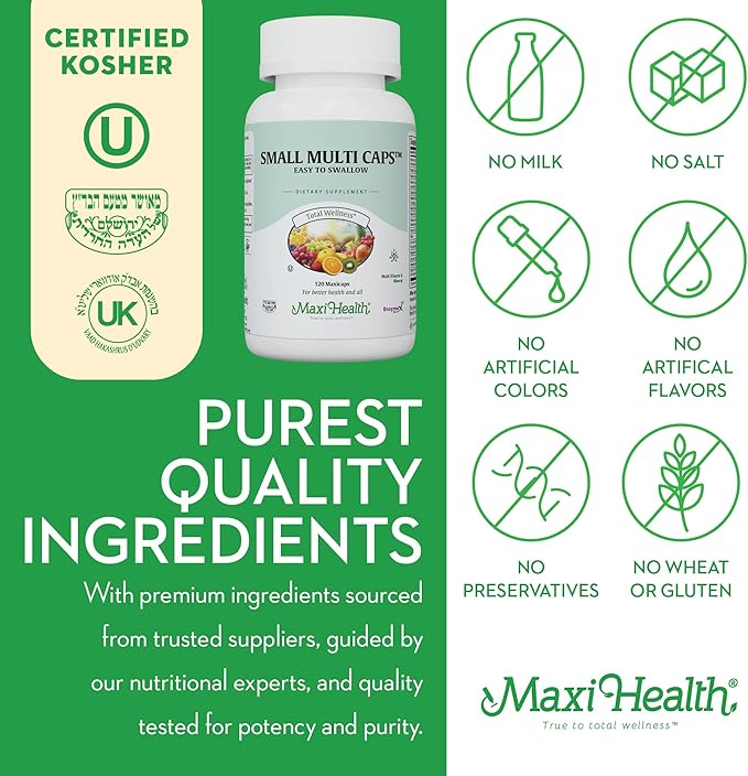 - TOTAL WELLNESS - Maxi Health has created a doctor formulated Total Wellness multi vitamin and mineral nutrient support capsule for adult men and women. Small Multi Caps come in an easy to swallow serving that contains 30 nutrients including essential vitamins, minerals and over 250 billion CFU/g probiotics. See label for full nutrient profile.