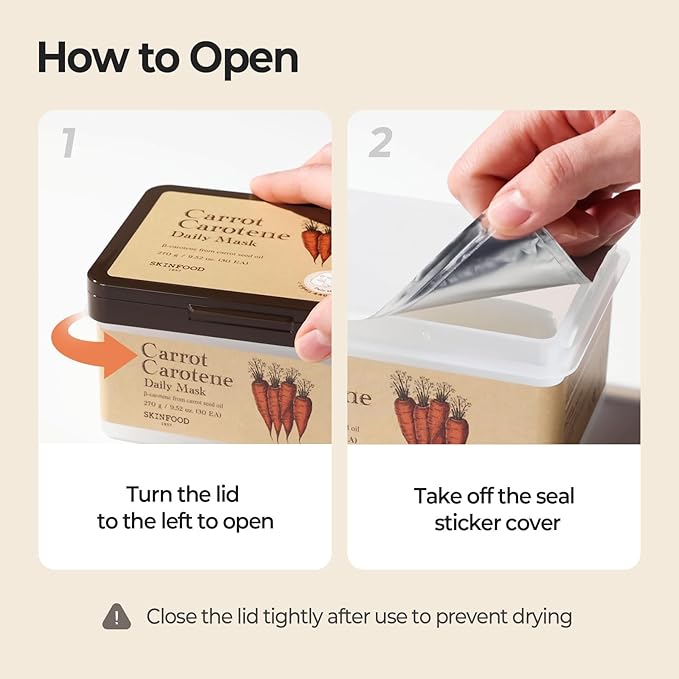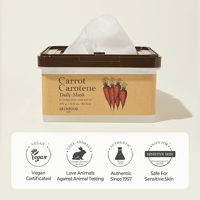 - 🥕 What is it? The Carrot Carotene Daily Mask is a hydrating face mask and calming sheet mask designed for daily use. Soaked in a soothing, hydrating essence, it’s specifically formulated to calm sensitive skin and irritated skin. Inspired by the success of Skinfood Carrot Carotene Calming Water Pads, which were celebrated as Olive Young No.1 toner pad product in 2023, this mask offers the same incredible benefits in a more convenient box sheet mask form. With just a 5-minute application and easy bulk packaging, it’s perfect for those with busy lifestyles who still want glow, healthy skin.
