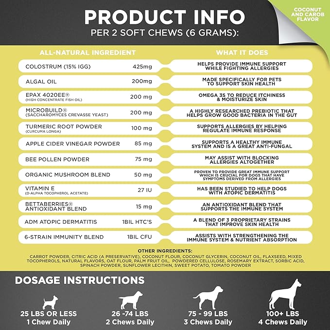 - NEW AND IMPROVED FORMULA: Our new formula Allergy & Immune support chews with omega 3 for dogs provides allergy relief for dogs itching and support a natural histamine response. Meaning less itching, sneezing, and scratching for your pup.